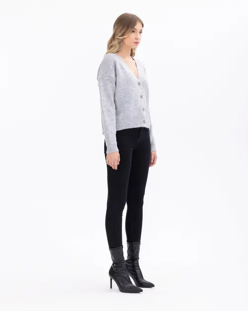 With its elegant stone details, the knit cardigan brings a modern touch to the classic knit design and offers a comfortable wearing experience thanks to its soft texture. The half turtleneck also protects against cold weather conditions. You can incorporate this cardigan into your daily looks.