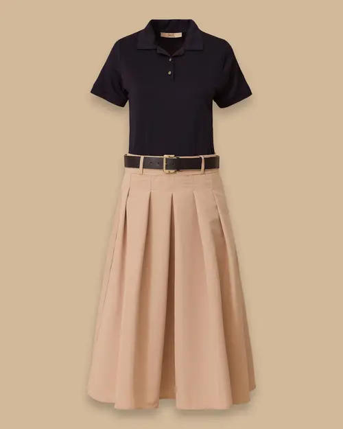 Polo Yaka Çift Parça Görünümlü Pileli Elbise, şık tasarımıyla rahat ve zarif görünüm sunar.
