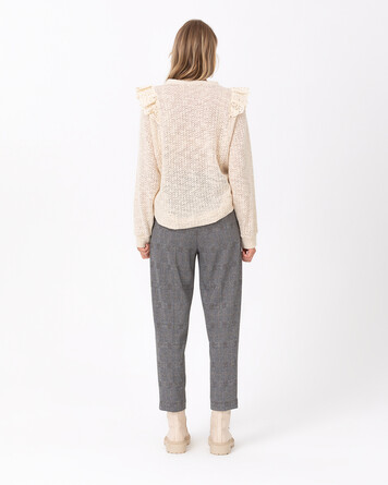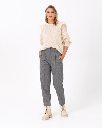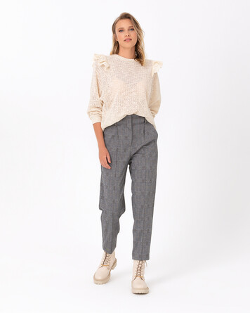 Deseni ile sezona göz kırpan pantolon, kesimi ile konfor sunuyor. Pantolonu, sade trikoların altında kombinleyerek öne çıkarabilirsiniz.
