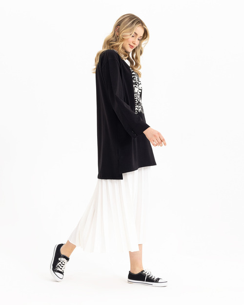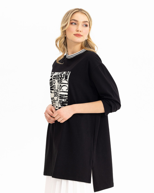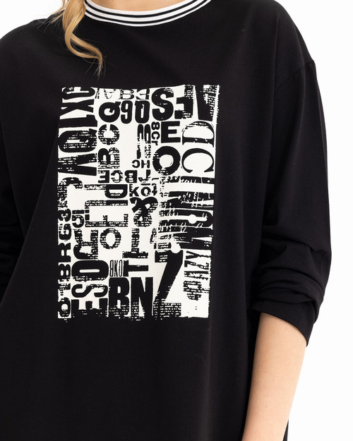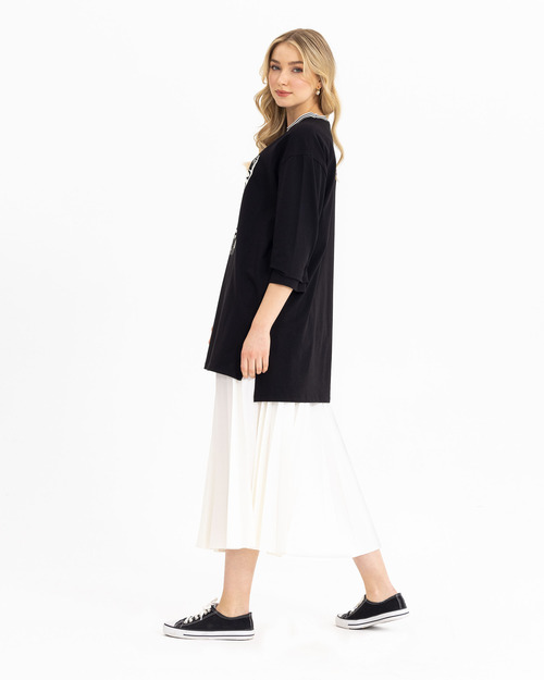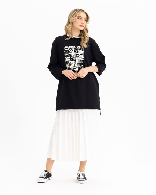 Dokusu ile konfor sağlarken, renkleri ve önündeki deseni ile şıklık katıyor. Tişörtü pliseli etekler üzerinde kombinlemeyi deneyebilirsiniz.