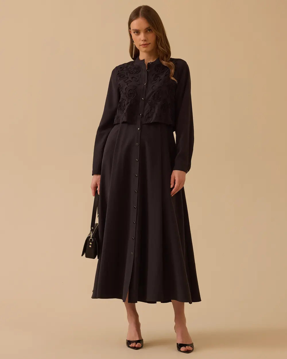 - katmanlı nakış detaylı elbise