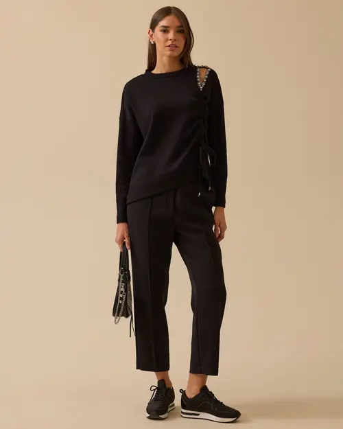 The Shirred Blouse with Stone Window Detail adds elegance to your style with its modern cut and sparkling detail.