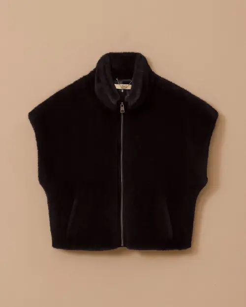 Stand Collar Zippered Faux Fur Vest offers stylish comfort on cold days with its modern cut.