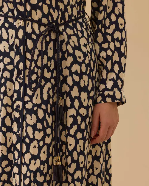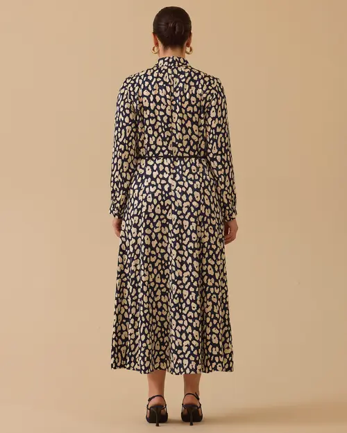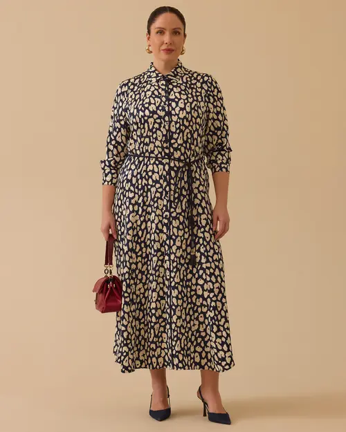Plus size patterned dress with lace-up waist, adapts to the body with its adjustable form, offers freedom of movement and provides comfort in daily wear.