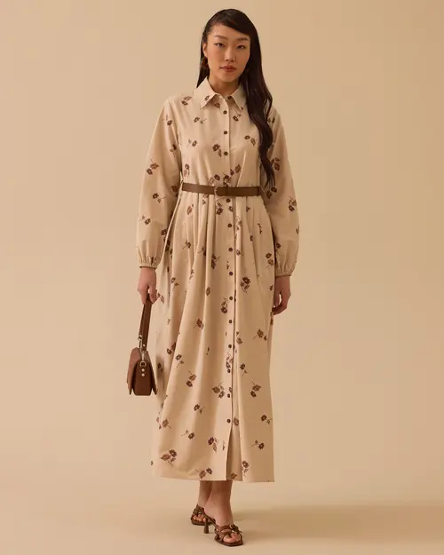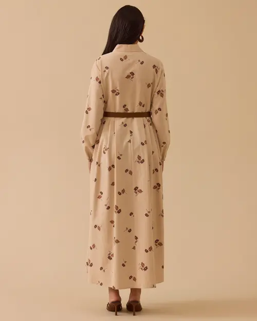 Floral Patterned Belted Long Dress offers a feminine silhouette with elegant floral patterns and a belt detail emphasizing the waist.