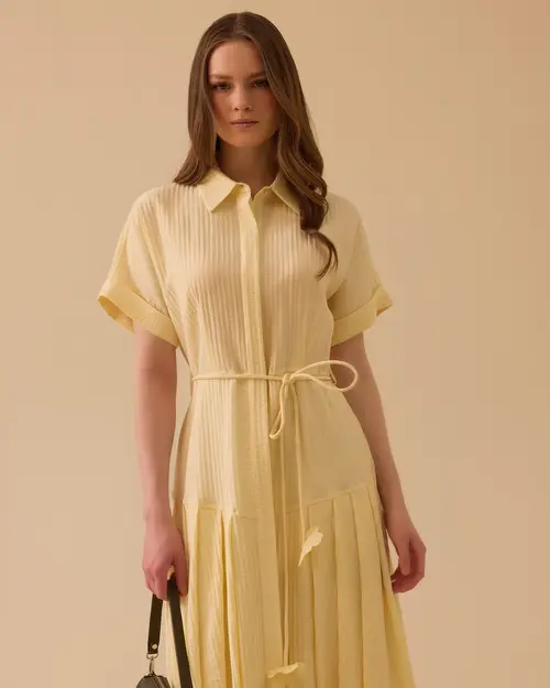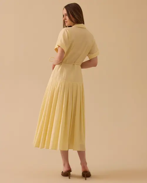 Striped Pleated Belted Dress offers a feminine style with its elegant lines and belt detail.