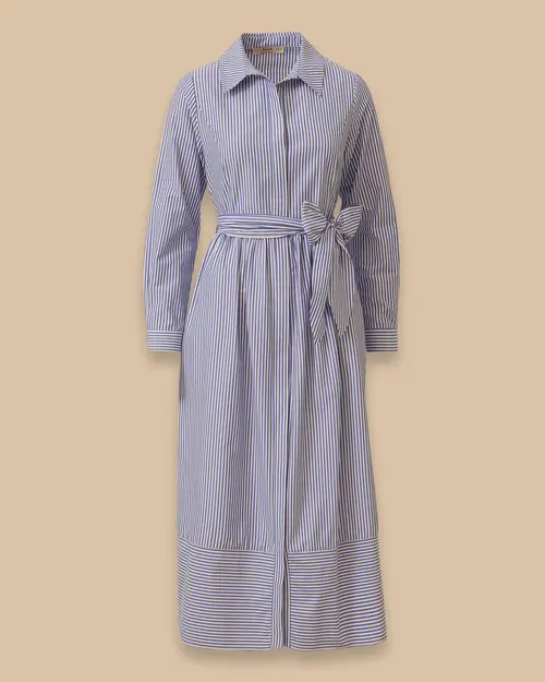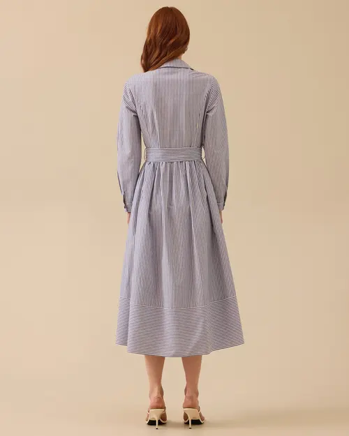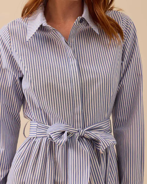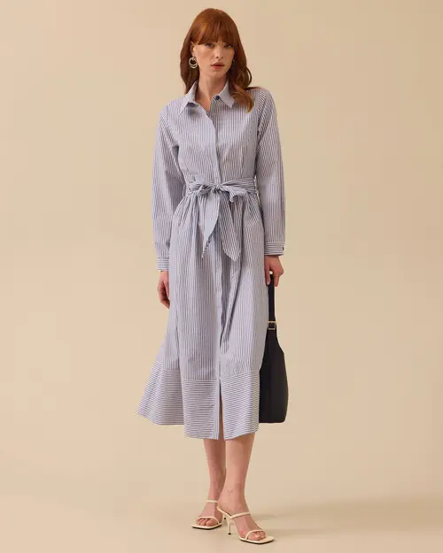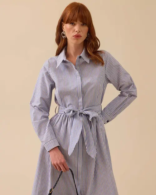 Striped Shirt Dress with Belt Detail offers elegance and comfort with its classic shirt collar design, belt emphasizing the waist and timeless striped pattern.