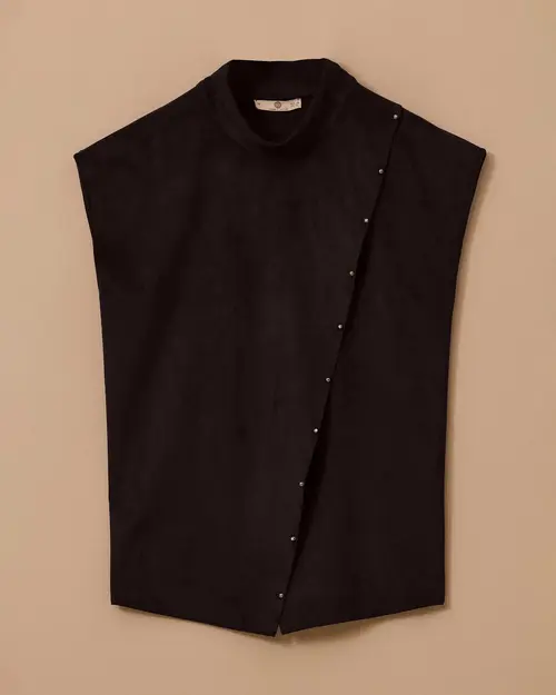 Stand Collar Asymmetric Suede Sweater offers a modern and stylish look with its soft suede texture and asymmetrical button details.