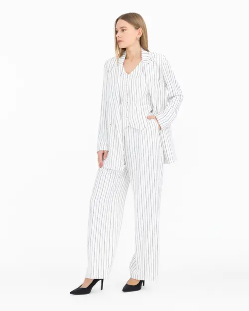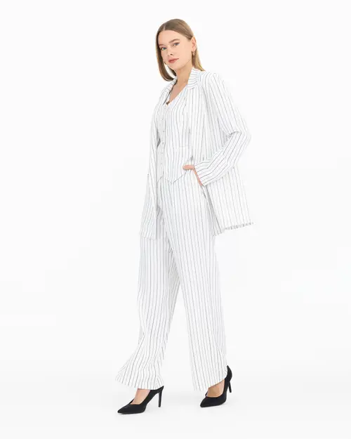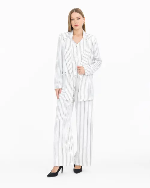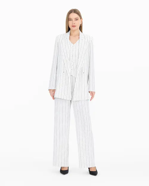 The striped double-breasted blazer jacket offers a captivating look with its fine striped pattern and lapel collar detail. When combined with the vest and pants, its elegance is multiplied. You can choose this jacket to reflect your style at special events and in professional settings.