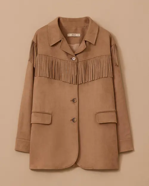 Suede Jacket with Tassel Detail highlights your style with its soft texture and vibrant design.