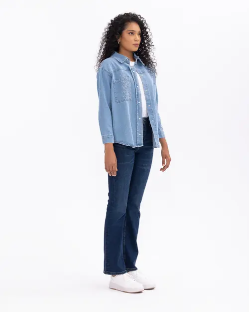 The stone-embellished denim shirt adds an elegant touch to the classic denim shirt. The stone details that adorn the shirt offer a chic and attention-grabbing look. These details, combined with the comfort of the durable denim fabric, create a style suitable for both daily use and special occasions. With this standout piece in your wardrobe, you can bring a luxurious flair to your outfits.