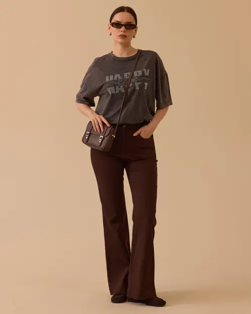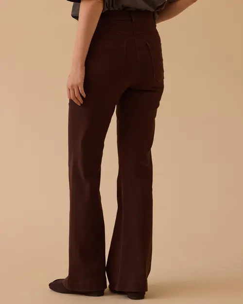 Flared Canvas Trousers create an elegant silhouette with a high waist cut and a flared leg that widens below the knee.