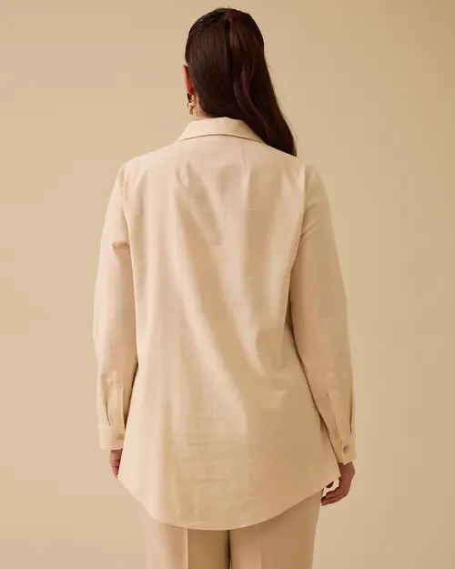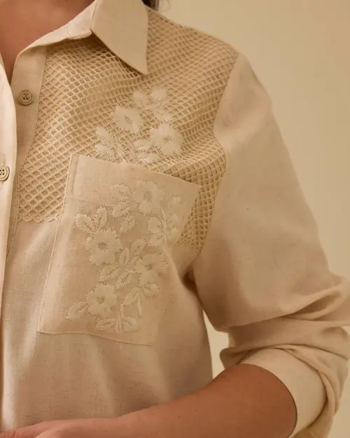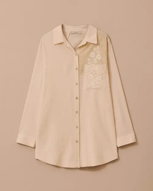 Plus Size Mesh Detailed Embroidered Shirt draws attention with its mesh texture on the chest and elegant embroidery.