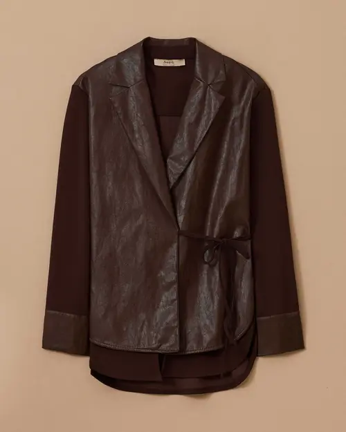 Double-breasted Shirt with Tie-Down Faux Leather Detail is suitable for business and casual outfits with its modern design.