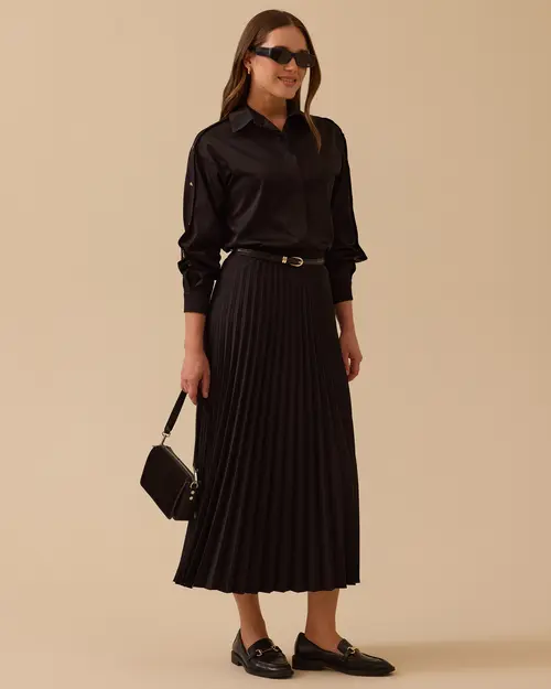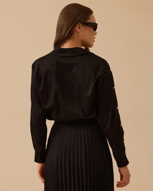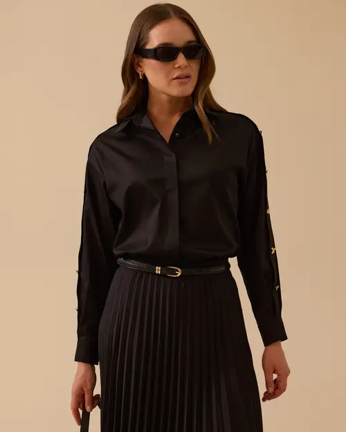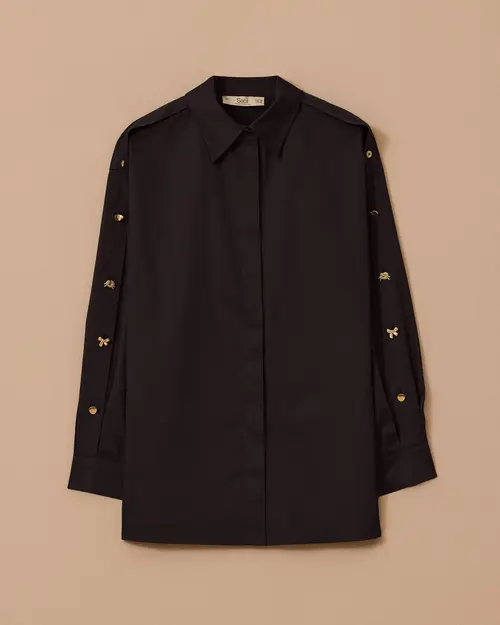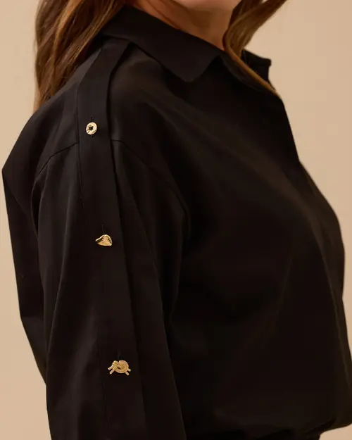 The Straight Cut Shirt with Gold Button Detail adds a modern touch to any outfit with its elegant gold buttons and stylish straight cut.
