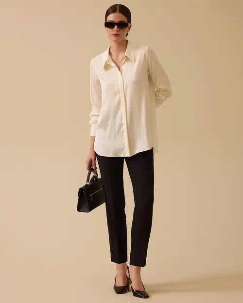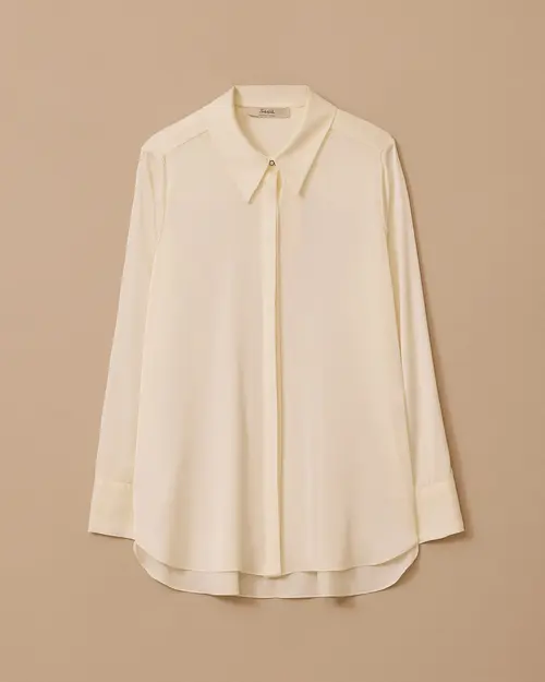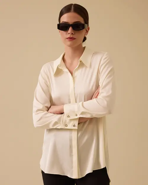The Satin Shirt with Hidden Buttons offers an elegant and modern look with its soft texture and shiny surface.