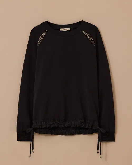 Shoulder Stone Ruffle Lace-up Sweatshirt combines elegance with comfort with sparkling stone details on the shoulders and ruffle lacing design at the hem.