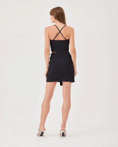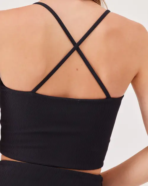 Black Crossbody Rib Crop Top will be an indispensable part of your wardrobe with a modern and stylish design. The elegant ribbed texture perfectly adapts to the body, offering a sophisticated look. The cross straps at the back add an aesthetic detail and create a unique style. This crop top is ideal for everyday wear and can be easily combined with any outfit.