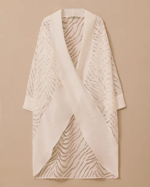 Zebra Patterned Asymmetric Cut Tunic offers elegance and comfort with its shawl collar detail and fluid fabric.