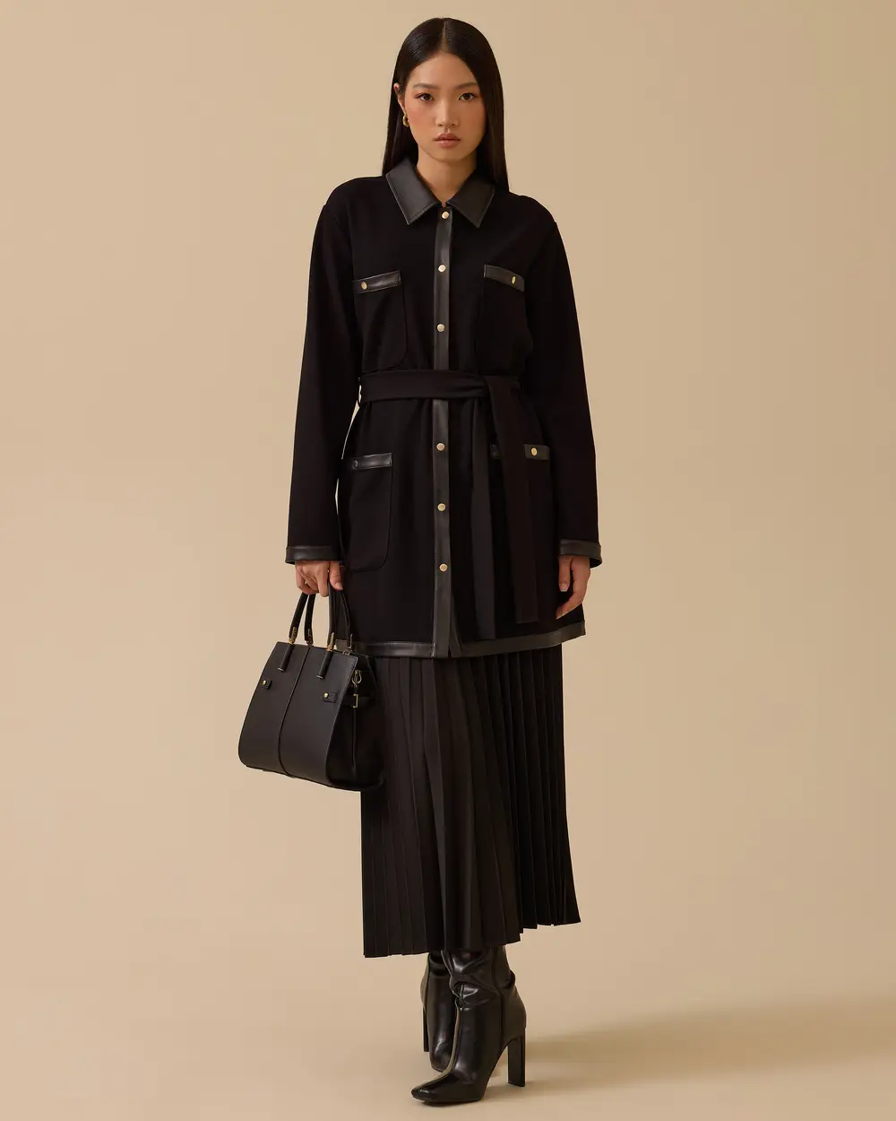 kuşaklı suni deri garnili düğmeli ceket