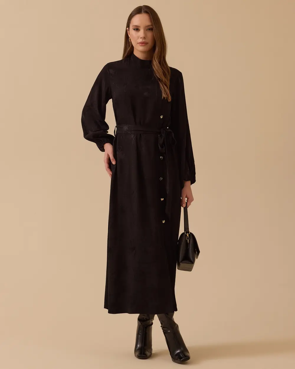 - desenli boncuk detaylı saten elbise