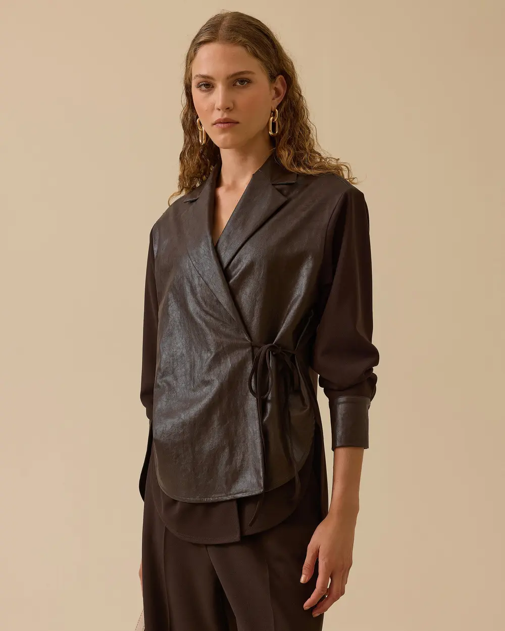 - bağlamalı suni deri detaylı kruvaze gömlek