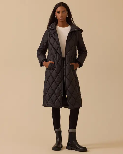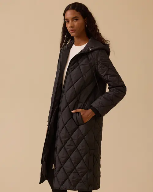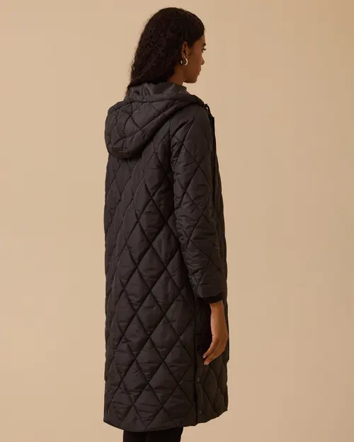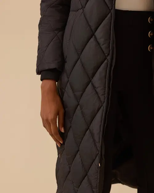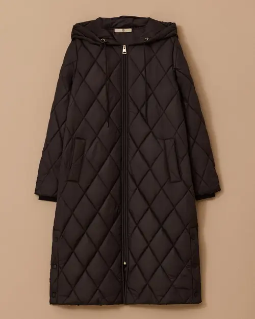 Kapüşonlu Uzun Kapitone Anorak Kaban, rahat kesimi ve sıcak tutan yapısıyla günlük kullanıma uygun.
