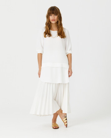 Mavi ve beyaz renk seçenekleri ile gardırobunuzda sıkça kullanacağınız parçalardan olacak tunik, zımba ve fermuar detayları ile hareketleniyor. Tuniği, pliseli etekler ile kombinleyerek rahat ve şık bir görünüm elde edebilirsiniz.