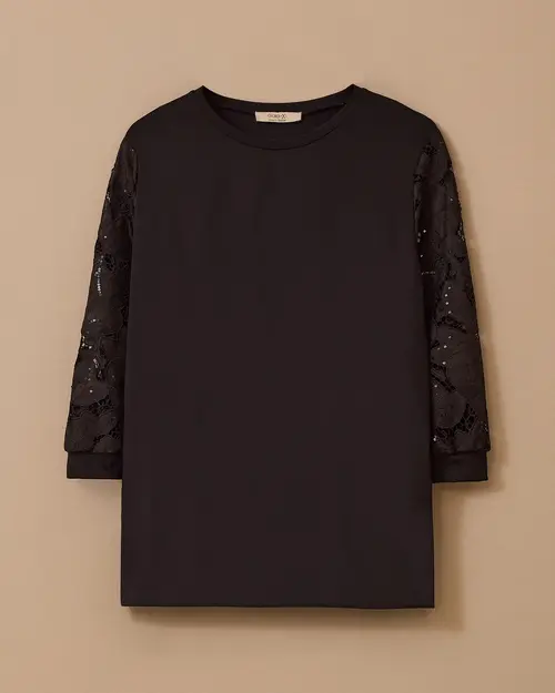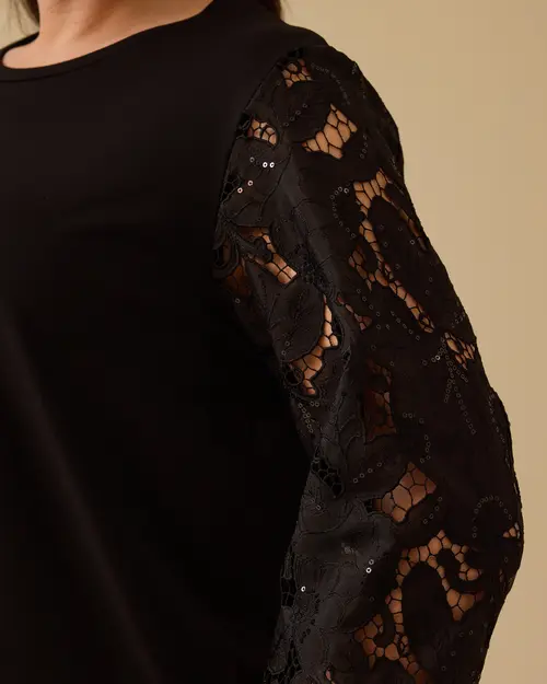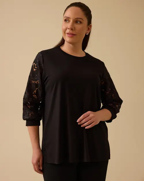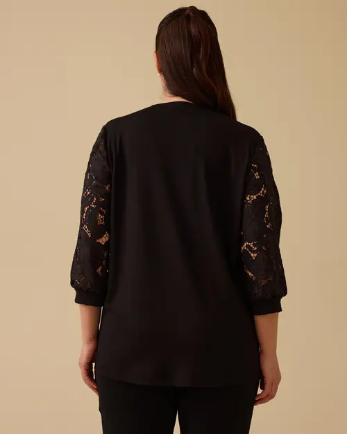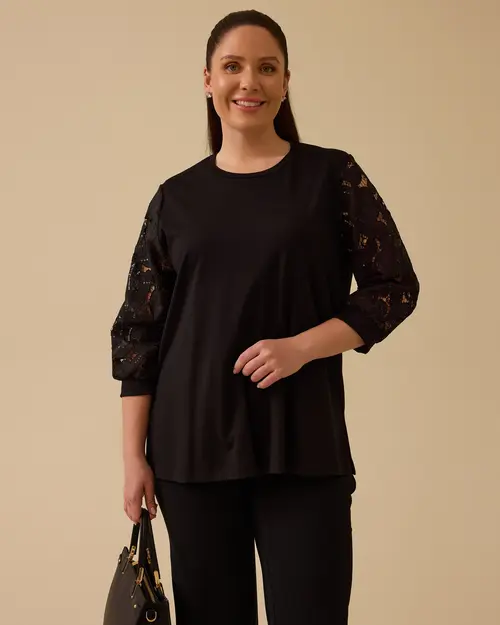 Büyük Beden Dantel Kollu Bluz, rahat kesimi ve şık dantel kollarıyla zarif bir görünüm sunar, günlük şıklığınızı tamamlar.