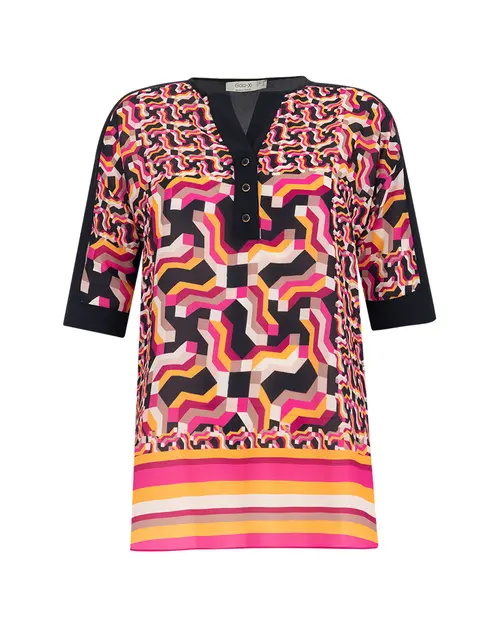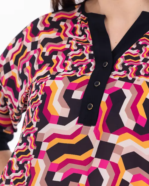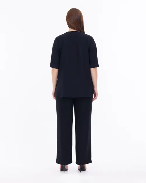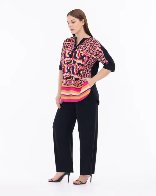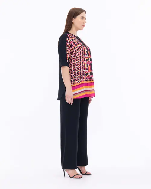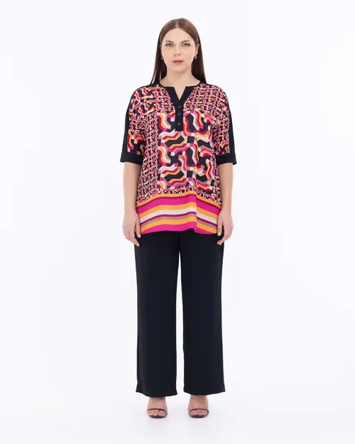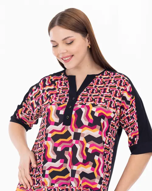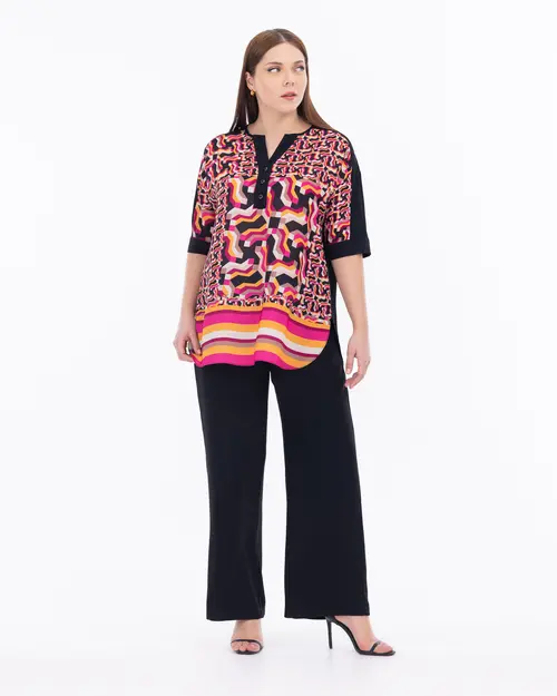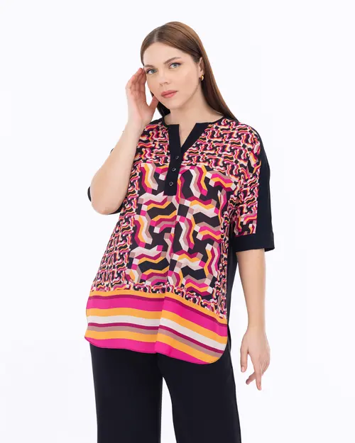 Büyük beden desenli kısa kollu bluz, geniş bedenlere uygun, şık ve ferah bir üst giyim seçeneğidir. Çeşitli desenlerle süslenmiş bluz, yaz aylarında rahatlık ve tarzı bir araya getirir. Kombinlemesi kolay ve günlük kullanıma vaya özel bir davete uygun bir parçadır.