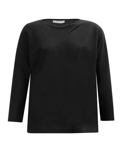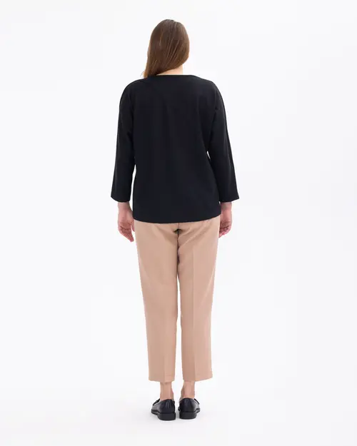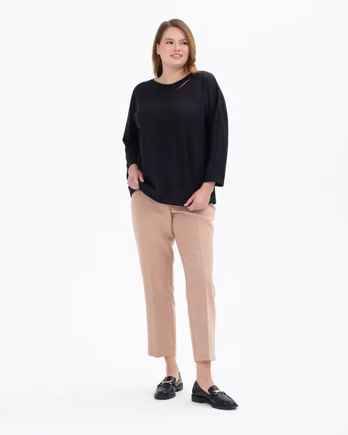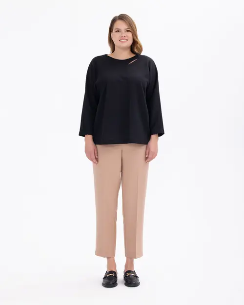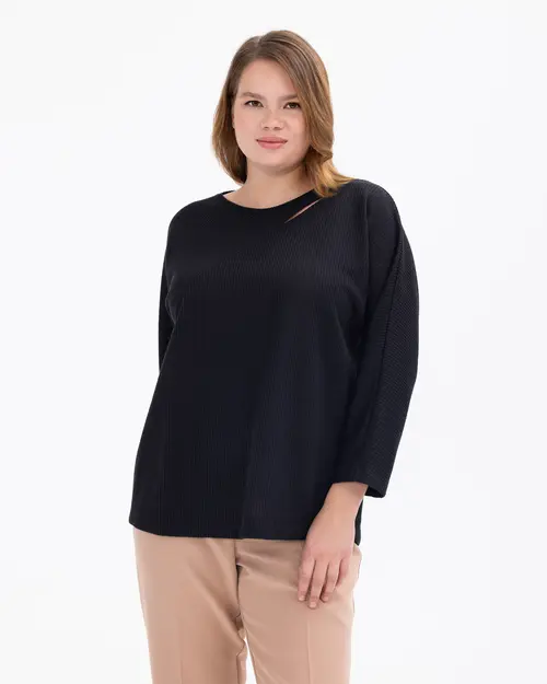 Büyük beden bluz, pencere detaylarıyla modern bir tarzı yansıtır. Rahat kesimi ve şık tasarımı ile gündelik ve özel durumlar için ideal bir seçenektir.
