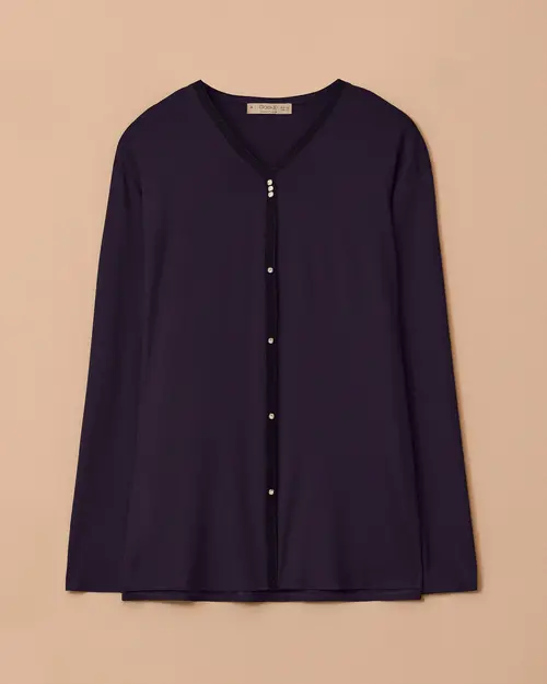 Büyük beden taşlı V yakalı bluz, rahat kesimiyle konfor sunar, yaka detayıyla dikkat çeker.