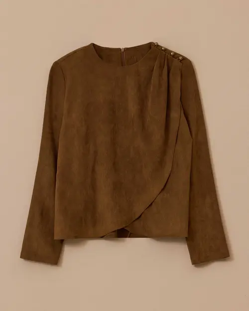 Drapeli Omuz Düğmeli Süet Bluz, yumuşak dokusu ve zarif detaylarıyla sade şıklığı ön plana çıkarır.