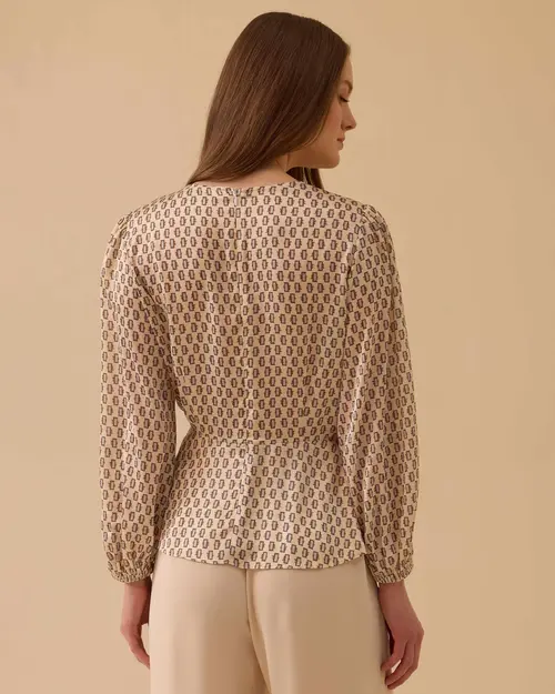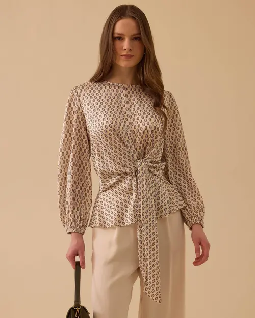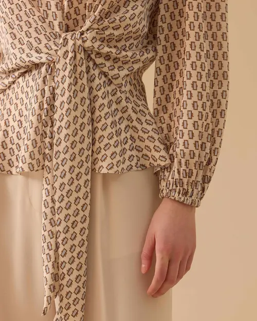 Bağlama detaylı desenli bluz, hareketli görünümüyle öne çıkar, hafif yapısı sayesinde gün boyu konfor sunar.