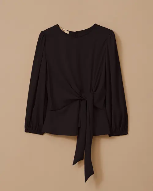 Bağlama detaylı uzun kollu bluz, hareketli görünüm sunar, farklı kombinlere kolay uyum sağlar.