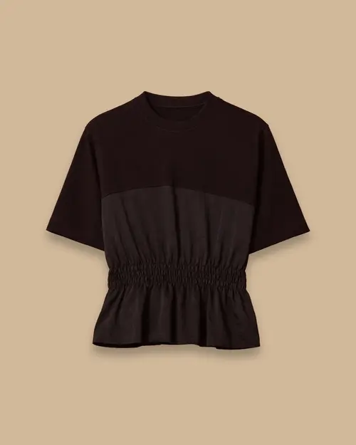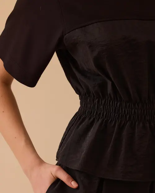 Çift Kumaşlı Beli Lastikli Bluz, farklı doku kombinasyonu ve lastikli bel detayıyla rahat, modern ve şık bir görünüm sunar.