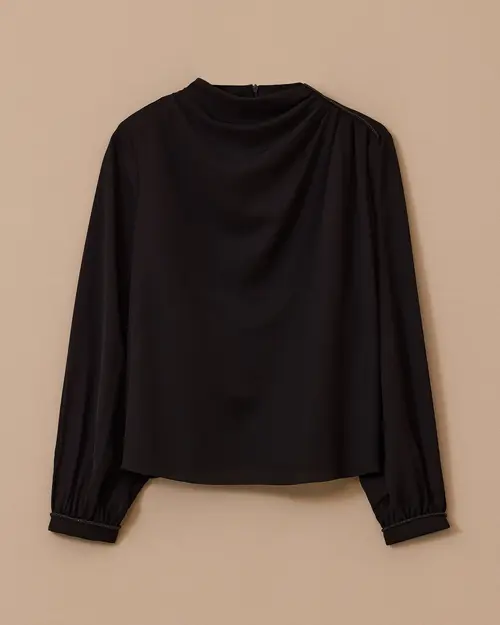 Dik Yaka Drape Detaylı Bluz, omuzdaki drape ayrıntısıyla şık ve modern bir görünüm sunar.
