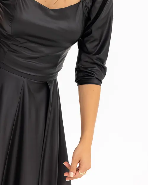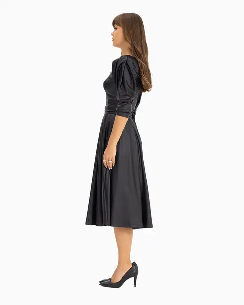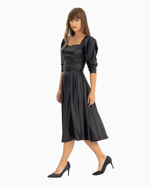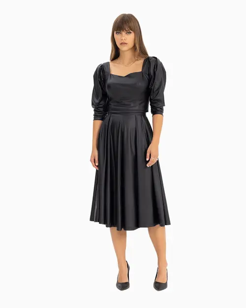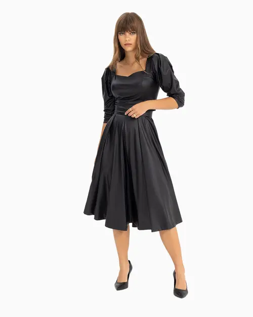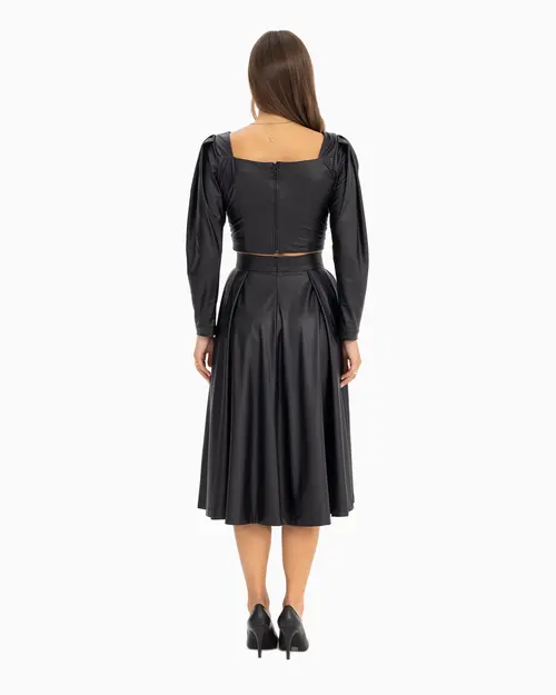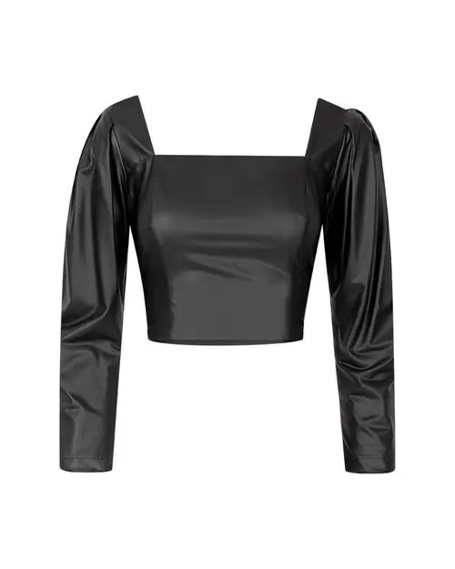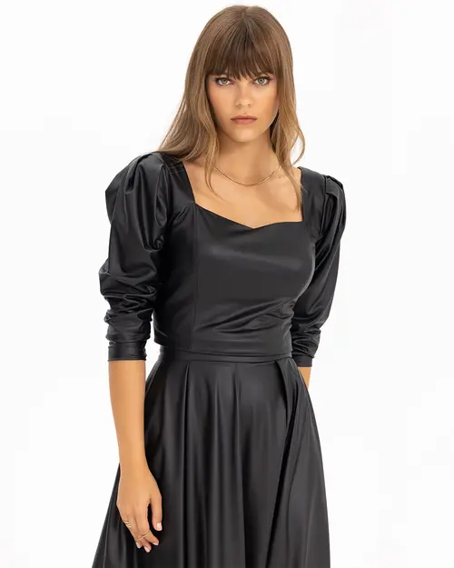 Deri formun hakim olduğu bluz, prenses kol detayı ile estetik bir görünüm kazanıyor. Bluzu, Seçil Suni Deri Midi Boy Etek ile tamamlayarak görünümünüzü güçlendirebilirsiniz.