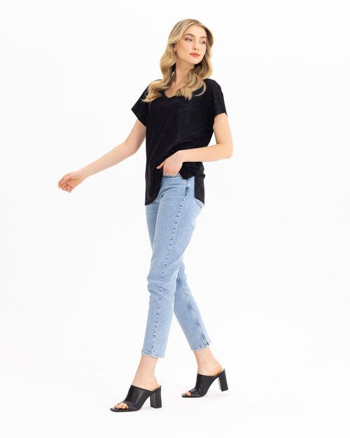 İnce dokusu ile konfor sunarken, v yakası ve sim deseni ile detaylanıyor. Tişörtü, jean pantolonların üzerinde kombinleyebilirsiniz.