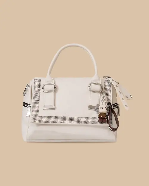 Aksesuarlı Taş Detaylı Çanta, parlak taş şeritleri ve figür aksesuarıyla dinamik ve dikkat çekici bir stil tamamlayıcısıdır.