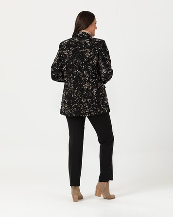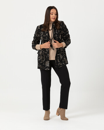 Deseni ile öne çıkan ceket, gardırobunuzun şık parçaları arasında yerini almaya hazır. Ceketi siyah klasik pantolonlar ile kombinleyerek ofis stilinden şık davetlere kadar birçok yere adapte edebilirsiniz.
