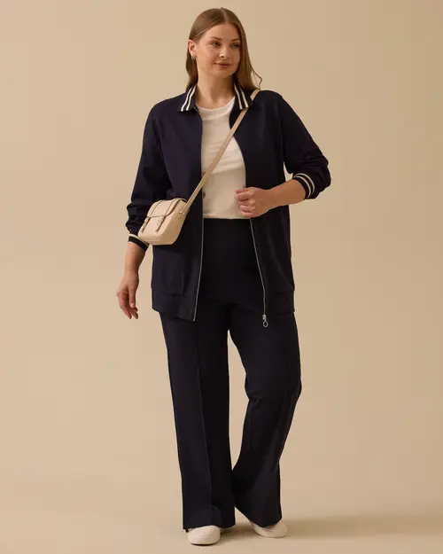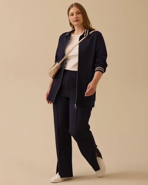 Büyük Beden Şerit Detaylı Fermuarlı Ceket, modern şerit detayları ve rahat kesimiyle şıklığı ve konforu bir arada sunar.