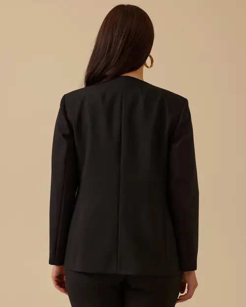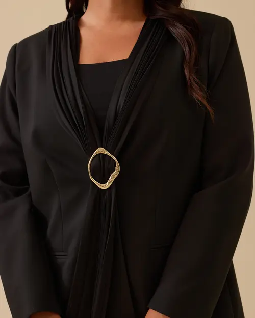 Büyük Beden Tokalı Ceket, şık şal yaka detayı ve altın rengi tokasıyla zarif bir görünüm sunar.