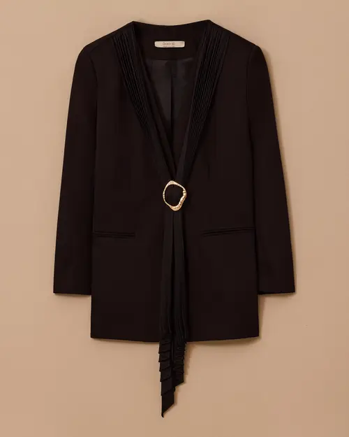 Büyük Beden Tokalı Ceket, şık şal yaka detayı ve altın rengi tokasıyla zarif bir görünüm sunar.