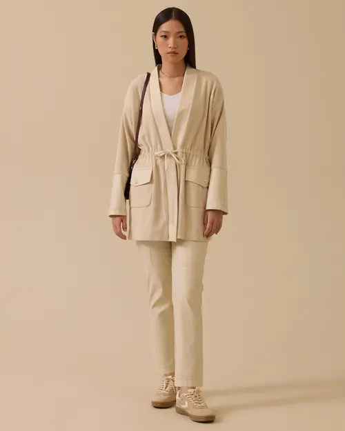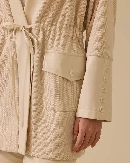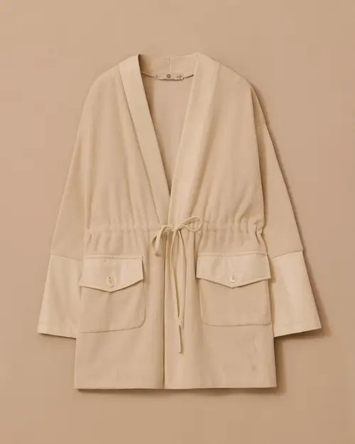Çift Kumaşlı Bağcıklı Örme Ceket, farklı dokuların uyumunu yansıtan tasarımı, bağcıklı beli ve fonksiyonel cepleriyle modern bir görünüm sunar.
