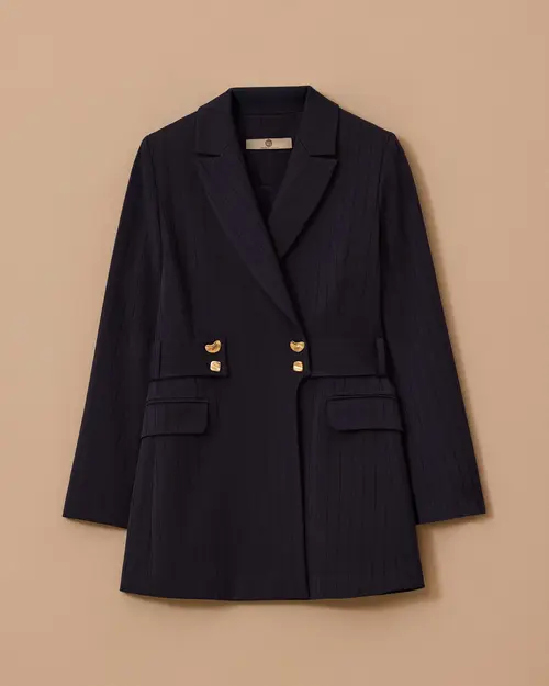 Çizgili Kruvaze Ceket, kusursuz kalıbı ve tokalı beliyle modern ve güçlü bir görünüm sunar.