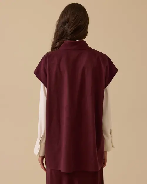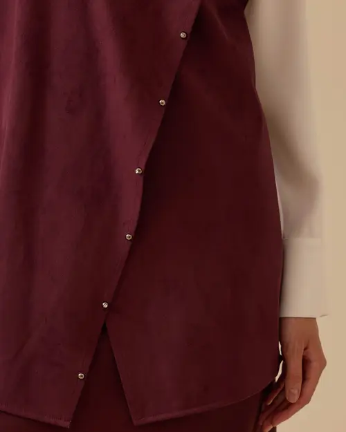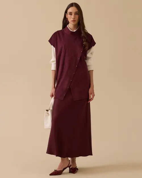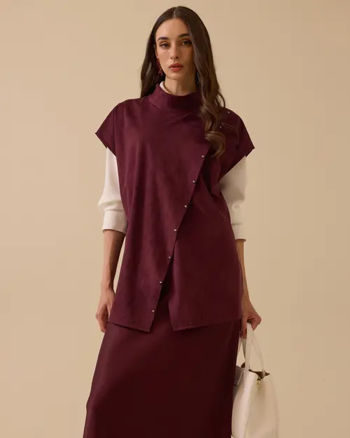 Dik Yaka Asimetrik Süet Süveter, yumuşak süet dokusu ve asimetrik düğme detaylarıyla modern ve şık bir görünüm sunar.