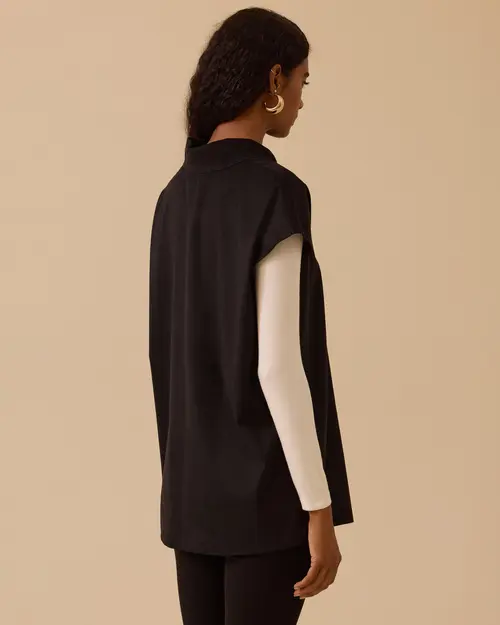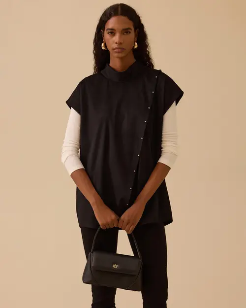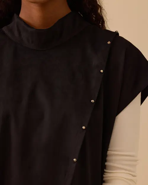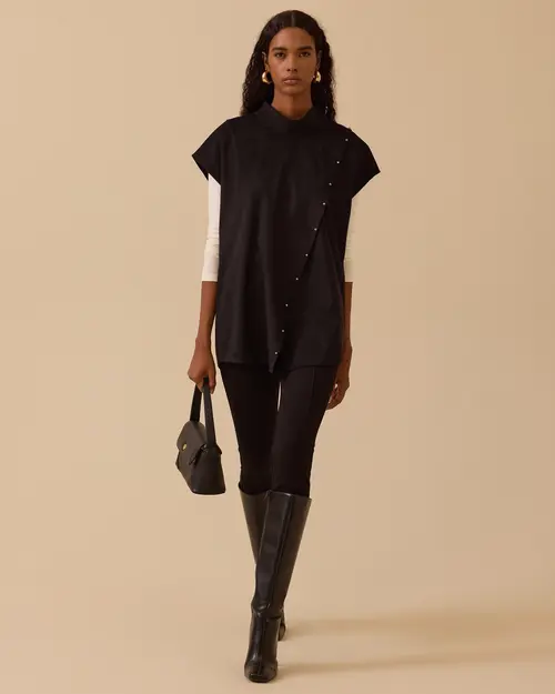 Dik Yaka Asimetrik Süet Süveter, yumuşak süet dokusu ve asimetrik düğme detaylarıyla modern ve şık bir görünüm sunar.