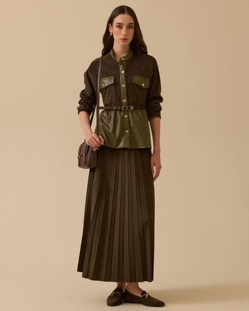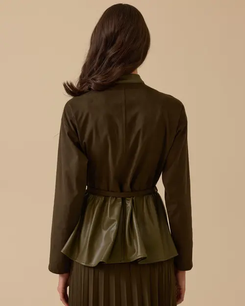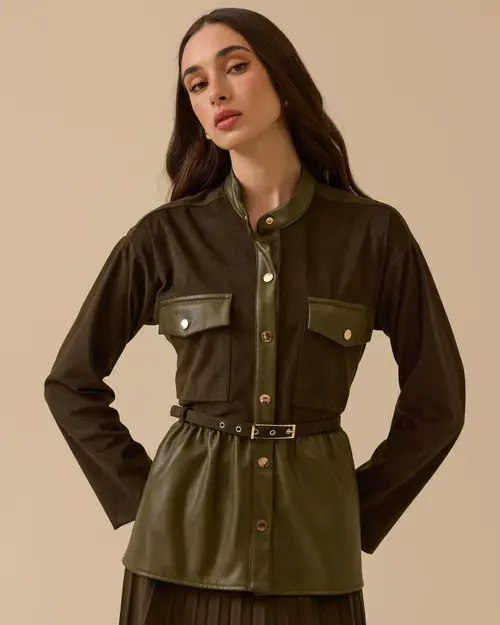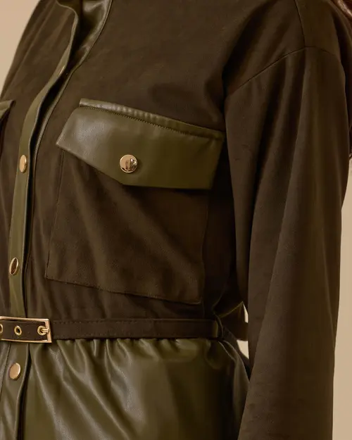 Suni Deri Detaylı Kemerli Süet Ceket, farklı dokuların uyumu, metal tokalı kemeri ve fonksiyonel cepleriyle modern ve şık bir stil sunar.