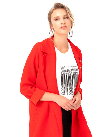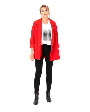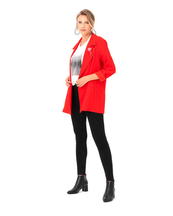 Yakasındaki boncuk işlemesi ile dikkat çeken ceket, rahat formu ile konfor sunuyor. Ceketi, siyah Seçil pantolon ve siyah botlarla kombinleyerek öne çıkarabilirsiniz.